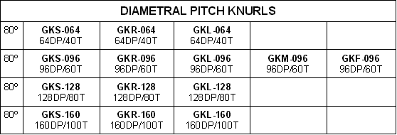 All Diametral Pitch Knurls made to American Standards (ASA B5.30 1958). Diametral Pitch Knurls produce the D.P. number of teeth per inch of diameter. Rolled Circular Pitch Knurls, produce the TPI number of teeth per inch of circumference measured normal to the teeth.